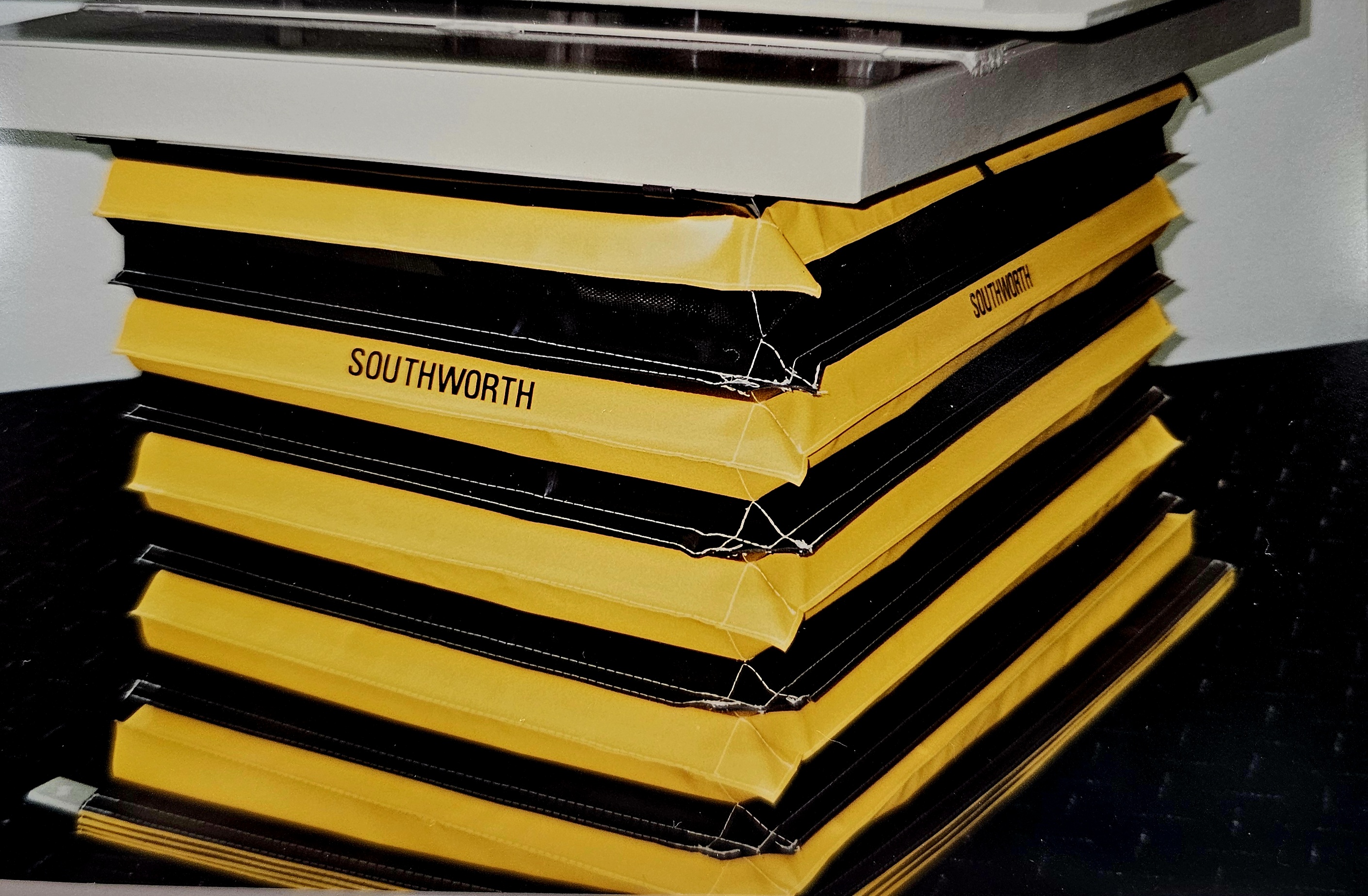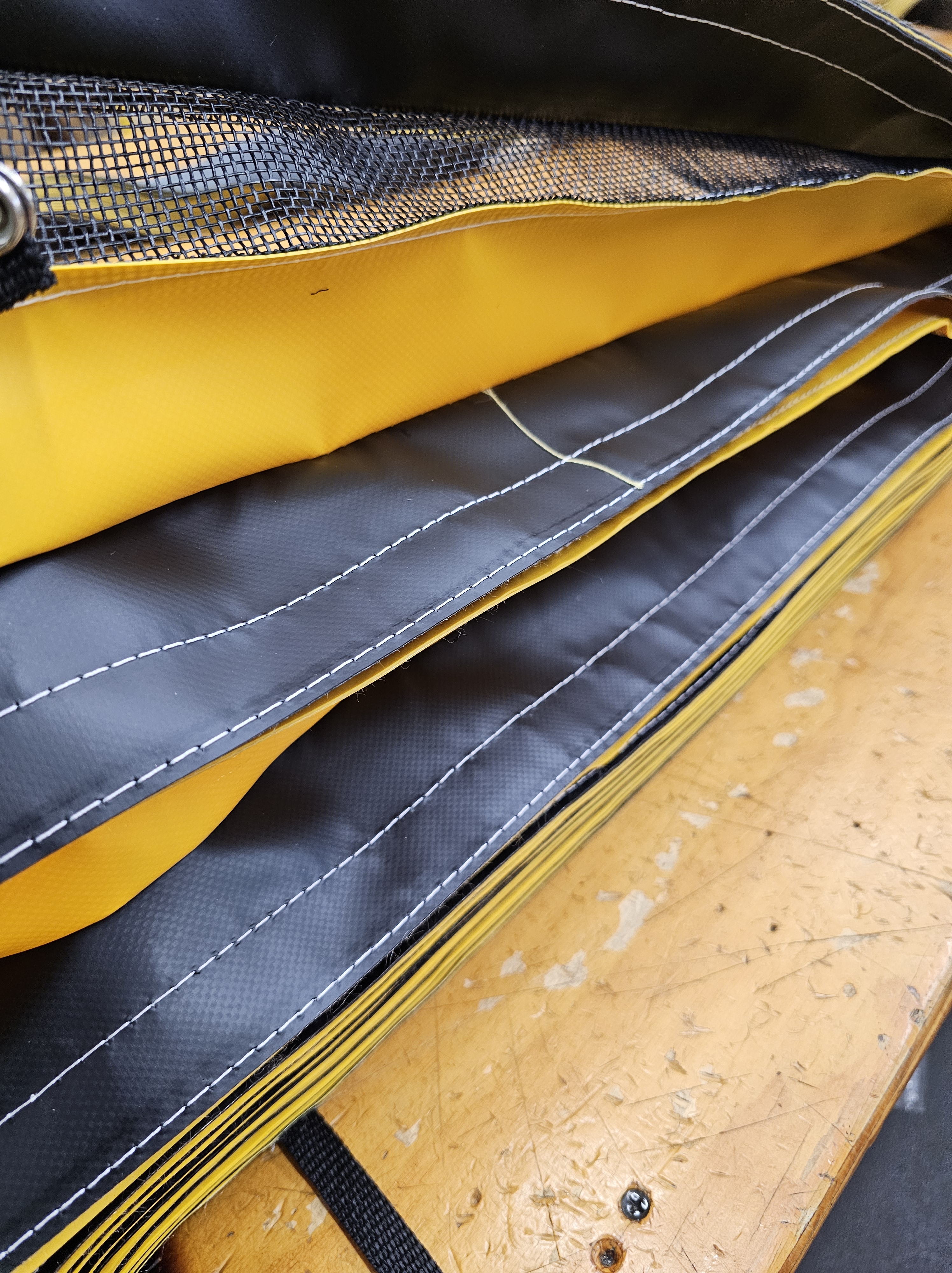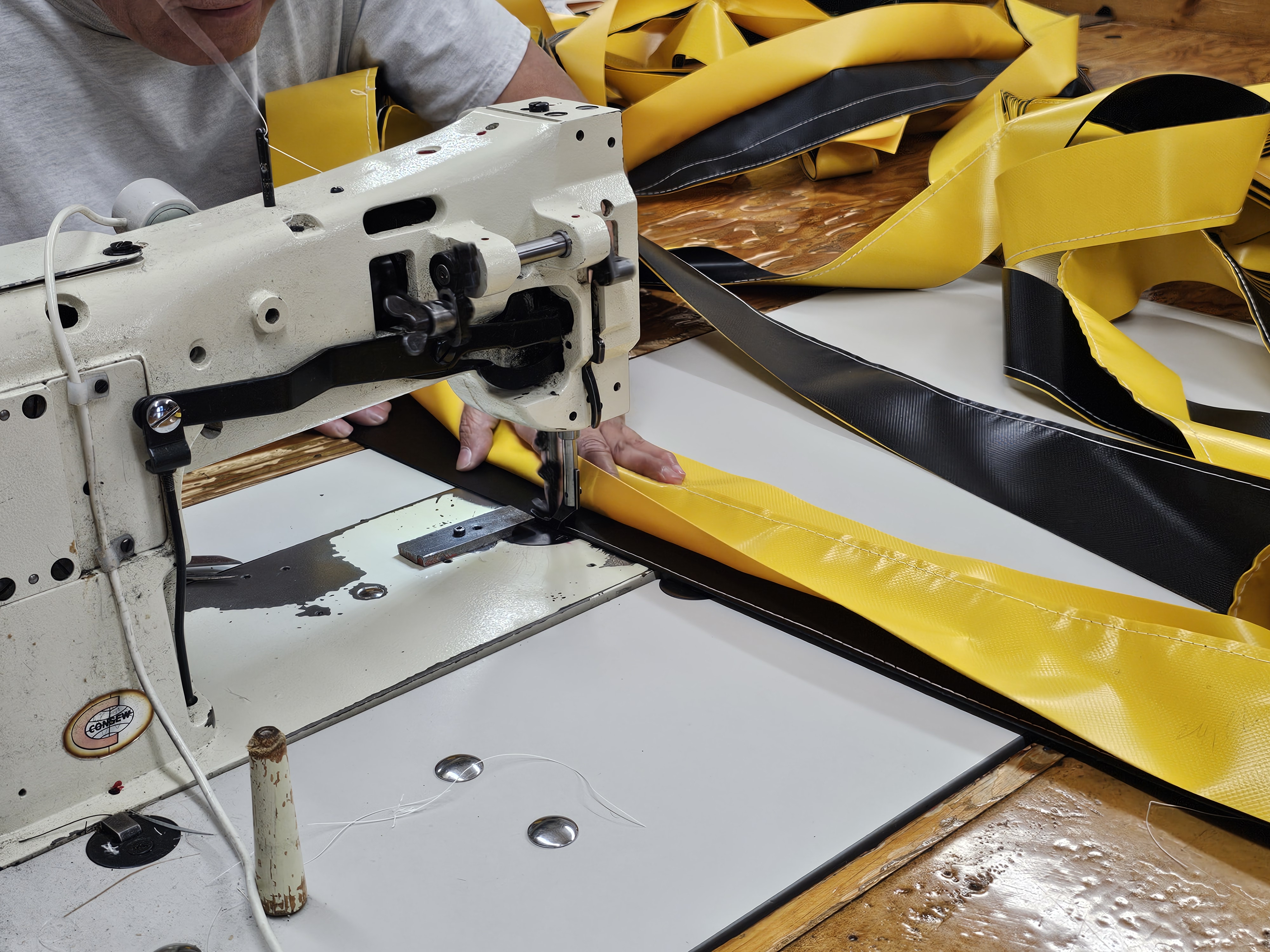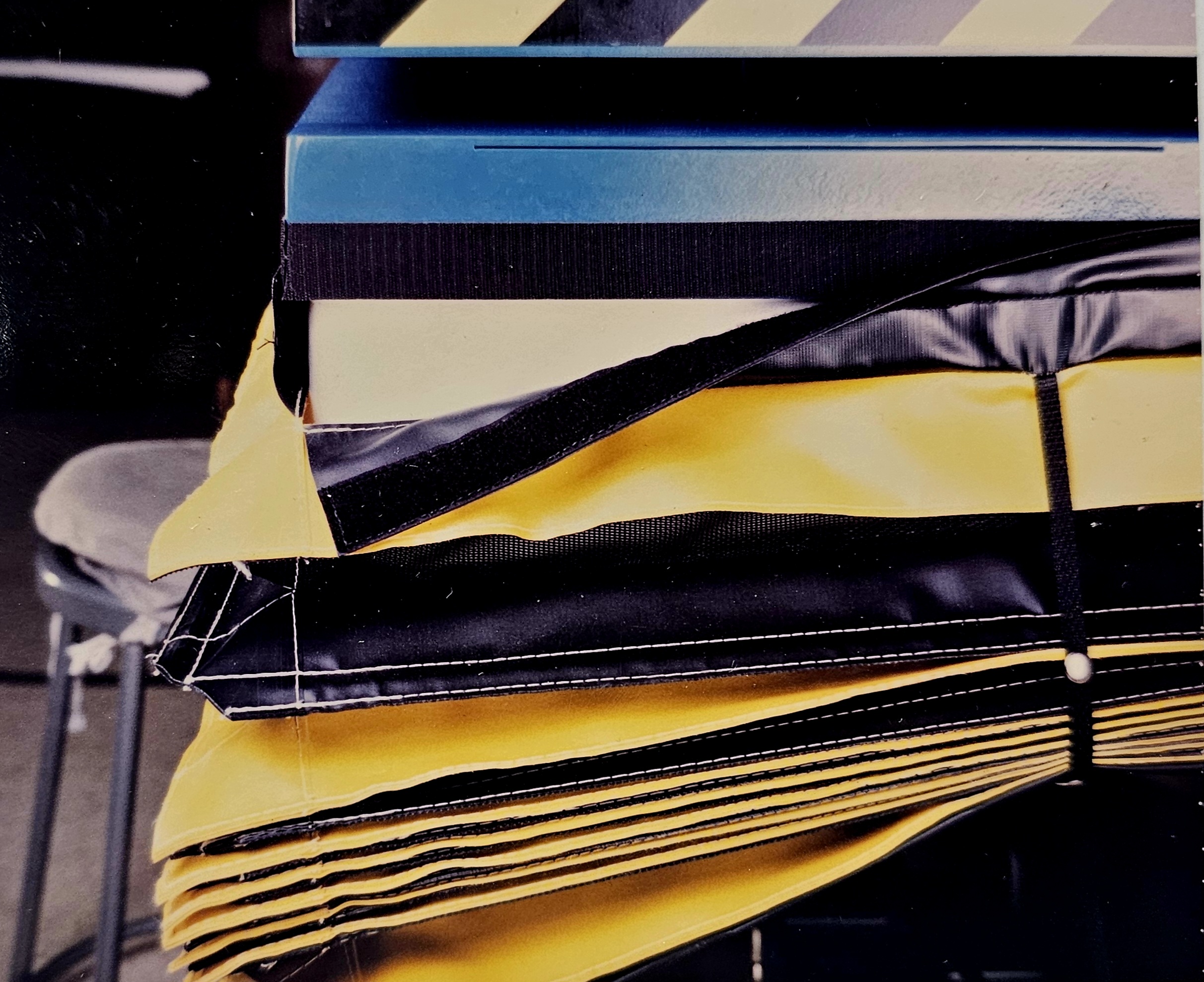 Stitched with care and precision. Our Table Guards are made with 22oz coated vinyl. Typically in alternating yellow and black folds. We also offer White, Orange, and high temperature fabric for welding and cutting environments.